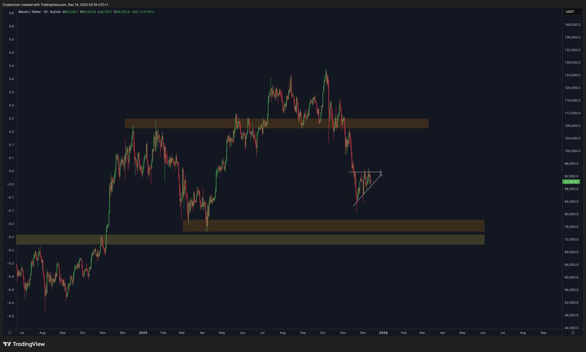 На графике Crypto Rover обозначены два основных направления в зависимости от того, как цена реагирует на формирование модели сжатия на младших таймфреймах. Если Биткойн потеряет растущую поддержку и упадет, график предполагает движение к нижней полосе ликвидности, расположенной в районе 78 000–82 000 долларов.