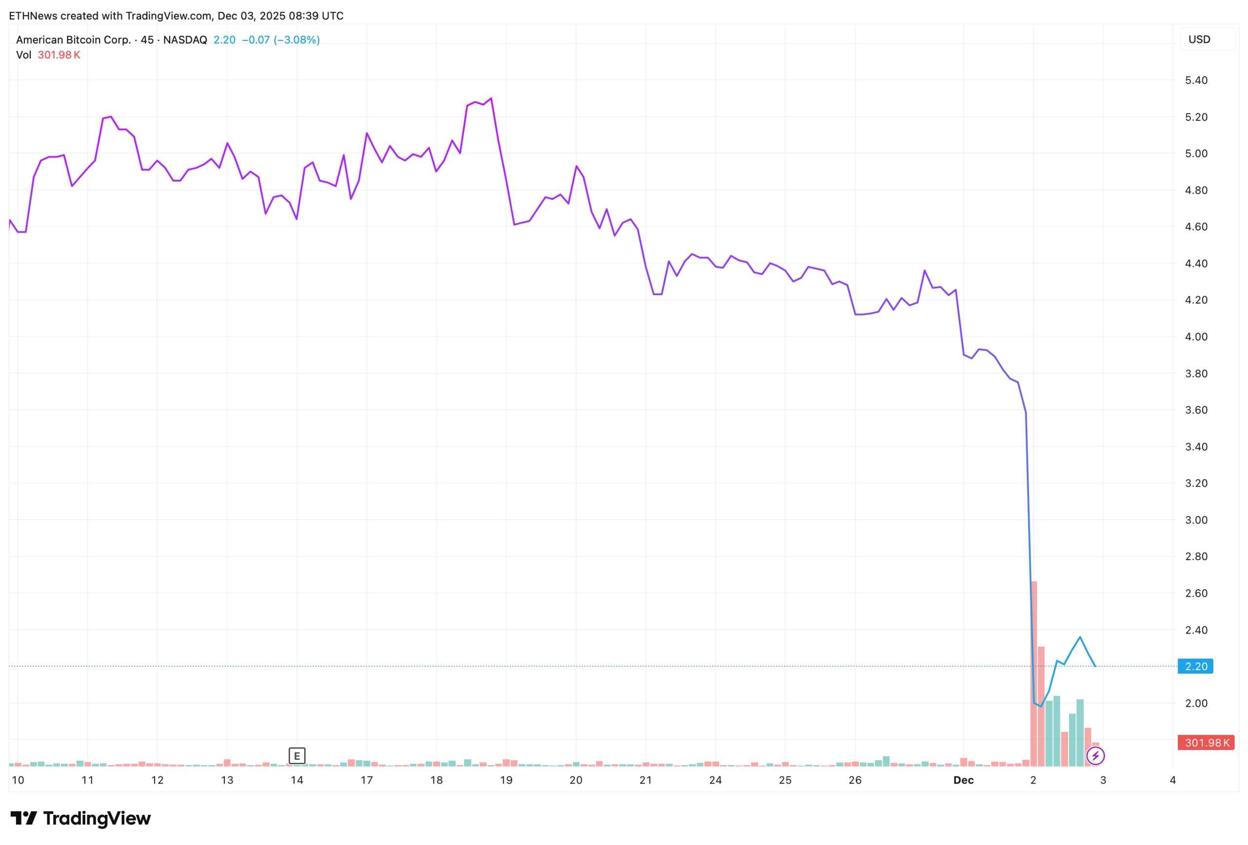 Американская Bitcoin Corp. (ABTC) испытала драматический рыночный шок во вторник, 2 декабря 2025 года: акции упали примерно на 50% менее чем за 30 минут после истечения периода блокировки для ранних инвесторов.