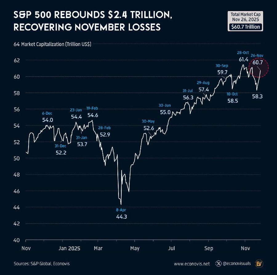 Совокупная рыночная капитализация индекса S&P 500 снова превысила отметку в $60 трлн, вернув почти все потери начала ноября и сигнализируя о возобновлении уверенности в акциях США. По данным S&P Global, 26 ноября 2025 года общая рыночная стоимость достигла $60,7 трлн, что стало одним из самых высоких показателей восстановления в году.